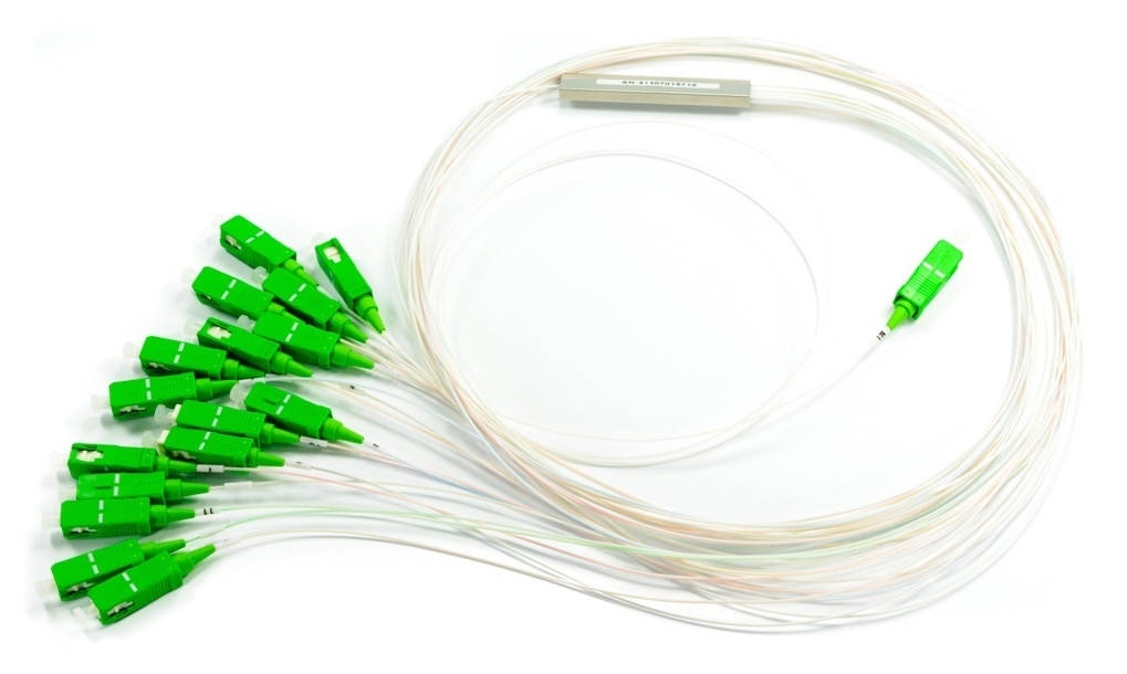 Splitter PLC z podziałem mocy optycznej 1:16. Włókna w powłoce typu pigtail o średnicy 0.9 mm (1 m długości). Splitter zakończony złączami optycznymi SC/APC wykonany w klasie Gold.